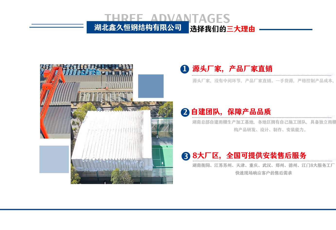 湖北鑫久恒鋼結(jié)構(gòu)有限公司是一家電動雨棚、膜結(jié)構(gòu)車棚研發(fā),生產(chǎn)銷售,施工安裝于一體的專業(yè)鋼結(jié)構(gòu)科技公司,主要產(chǎn)品有伸縮雨棚,電動雨棚,膜結(jié)構(gòu)車棚等。 湖南地區(qū)職員目前有80多人,占地面積20000平方米,廠房面積15600平方米,配備先進(jìn)的生產(chǎn)流水線,使每件品質(zhì)產(chǎn)品的堅實基礎(chǔ)。 公司在蘇州、天津、重慶、武漢、德州、烏魯木齊、江門均設(shè)有服務(wù)工廠,總?cè)藛T共300多人,擁有專業(yè)的技術(shù)團(tuán)隊,配備先進(jìn)的設(shè)備和流水線生產(chǎn),產(chǎn)能高,貨源充足,發(fā)貨速度快,服務(wù)區(qū)域廣。 移動伸縮棚適用于通道臨時倉儲、戶外運(yùn)動遮陽、污水池遮蓋、能源交通、熱力化工、礦山、船舶制造及市政建設(shè)、物流、碼頭等領(lǐng)域的構(gòu)件制作加工,成品半成品存放、倉庫、野外儀器設(shè)備操作用房等。尤其是對工廠發(fā)貨、倉儲臨時遮雨防嗮,梅雨期較長、建設(shè)周期較短的工程施工等特別適用。還可根據(jù)用戶需求量身定制、適合企業(yè)所需不同款式的產(chǎn)品。 我公司堅持“誠信社會為本,客戶滿意為榮”的經(jīng)營理念,做到質(zhì)量把控,嚴(yán)格管理,精益求精,恪守承諾。使鑫久恒逐步走向成熟,其系統(tǒng)化、專業(yè)化日趨完善。以專業(yè)的技術(shù)、科學(xué)的管理,更高的產(chǎn)品質(zhì)量,優(yōu)良的企業(yè)信譽(yù),真誠的客戶服務(wù),靈活多樣的經(jīng)營方式和務(wù)實創(chuàng)新的企業(yè)精神愿與社會各界攜手合作,為推動智能鋼結(jié)構(gòu)建筑事業(yè)的發(fā)展而不斷努力。...